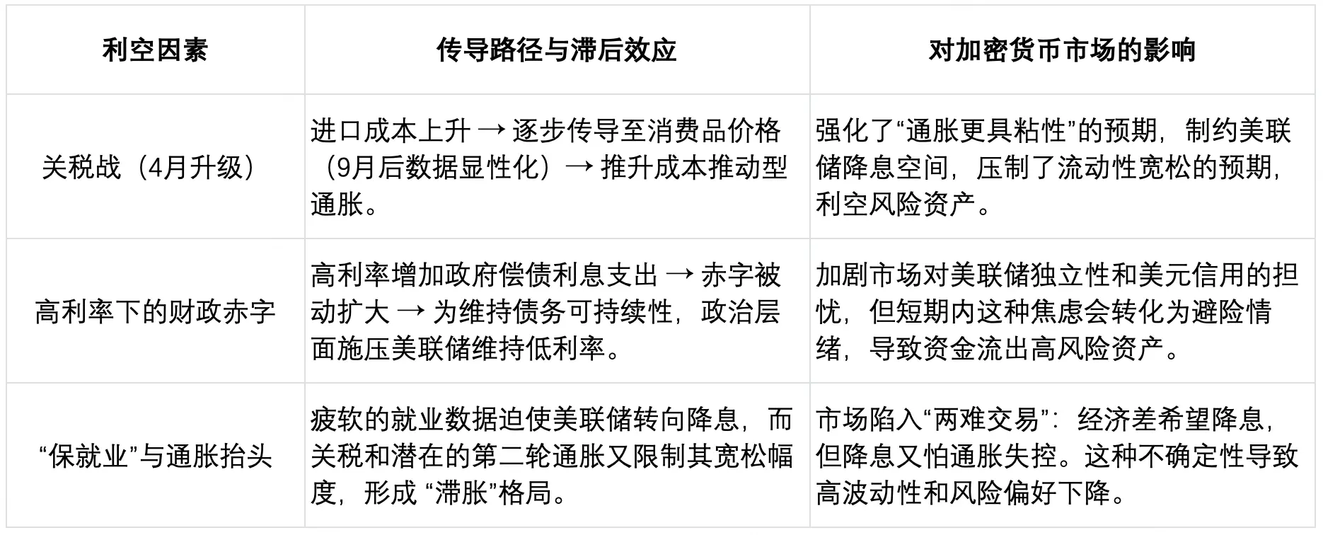 正是上述利空在9月份后的逐步兑现,导致了加密货币市场的上涨乏力。市场逻辑从“交易降息”转向 “担忧滞胀” 。投资者意识到,美联储的降息并非强势经济的主动调控,而是应对经济放缓的被动举措,甚至可能以牺牲物价稳定为代价。这种背景下的宽松,其成色远不及流动性驱动型牛市所需求的条件。