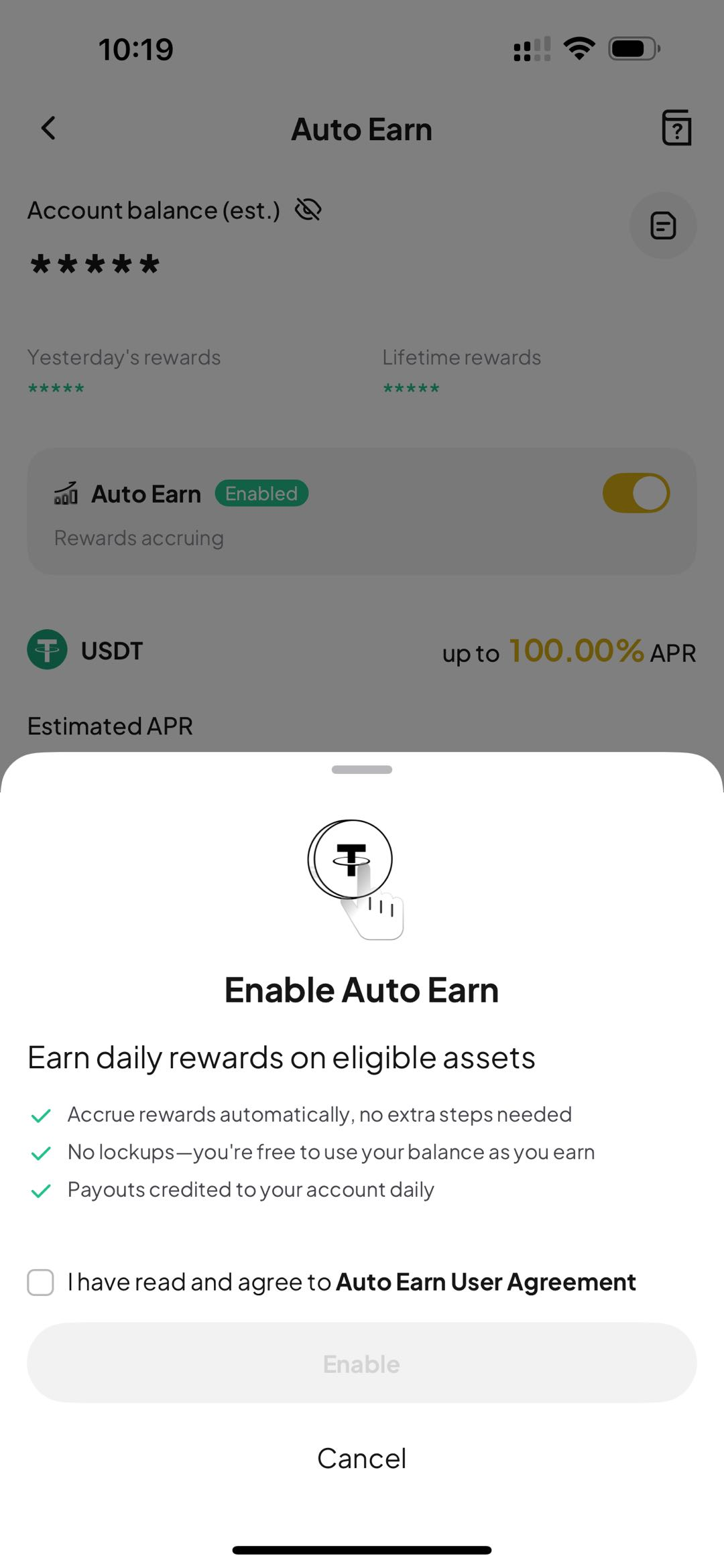 3.计息额度上限为 10,000 USDT;超出 10,000 USDT 的部分将不计息,系统仅对上限内的余额计算收益。