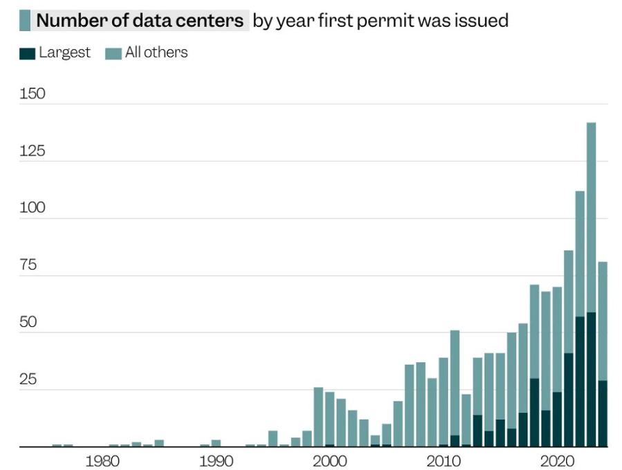 这张图表显示了美国数据中心在过去 20 年中的爆炸性增长。2010 年,美国已建成或获批建设的数据中心为 311 座,而在 2024 年,这一数字为 1240 座,几乎是 2010 年的 4 倍。