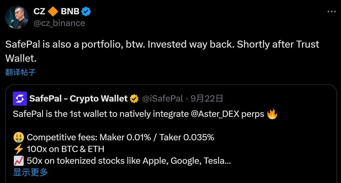 其中还有一个极具说服力的特别信号,许多人都未曾注意:SafePal 本身就是 APX Finance(Aster 前身)的早期投资方,而此次被 CZ 转发推文,也正是 SafePal 作为「首个原生内置集成 Aster 的钱包」发布的。
