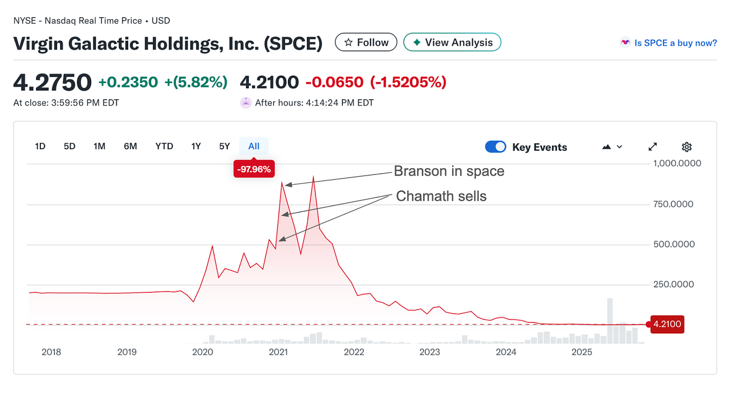 特殊目的收购公司(SPAC )的发起人赚得八位数的利润,他们赚得数千万,而他们推广的股票却下跌了99%以上。维珍银河(Virgin Galactic)在将理查德·布兰森送上太空时曾有过高光时刻,创造了辉煌的纪录。而查马斯(Chamath)则带着 3.15 亿美元离场。看看普通股东的表现吧: