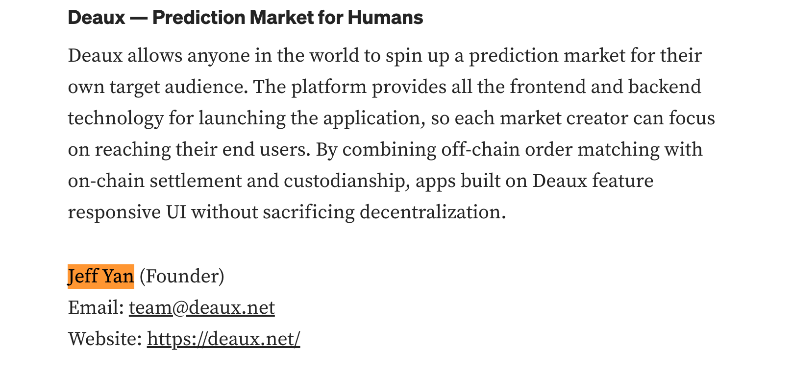 在他们发布的 Medium 文章中,2019 年 Season 1 孵化项目名单里出现了一个名为 Deaux 的项目,创始人正是 Jeff Yan。