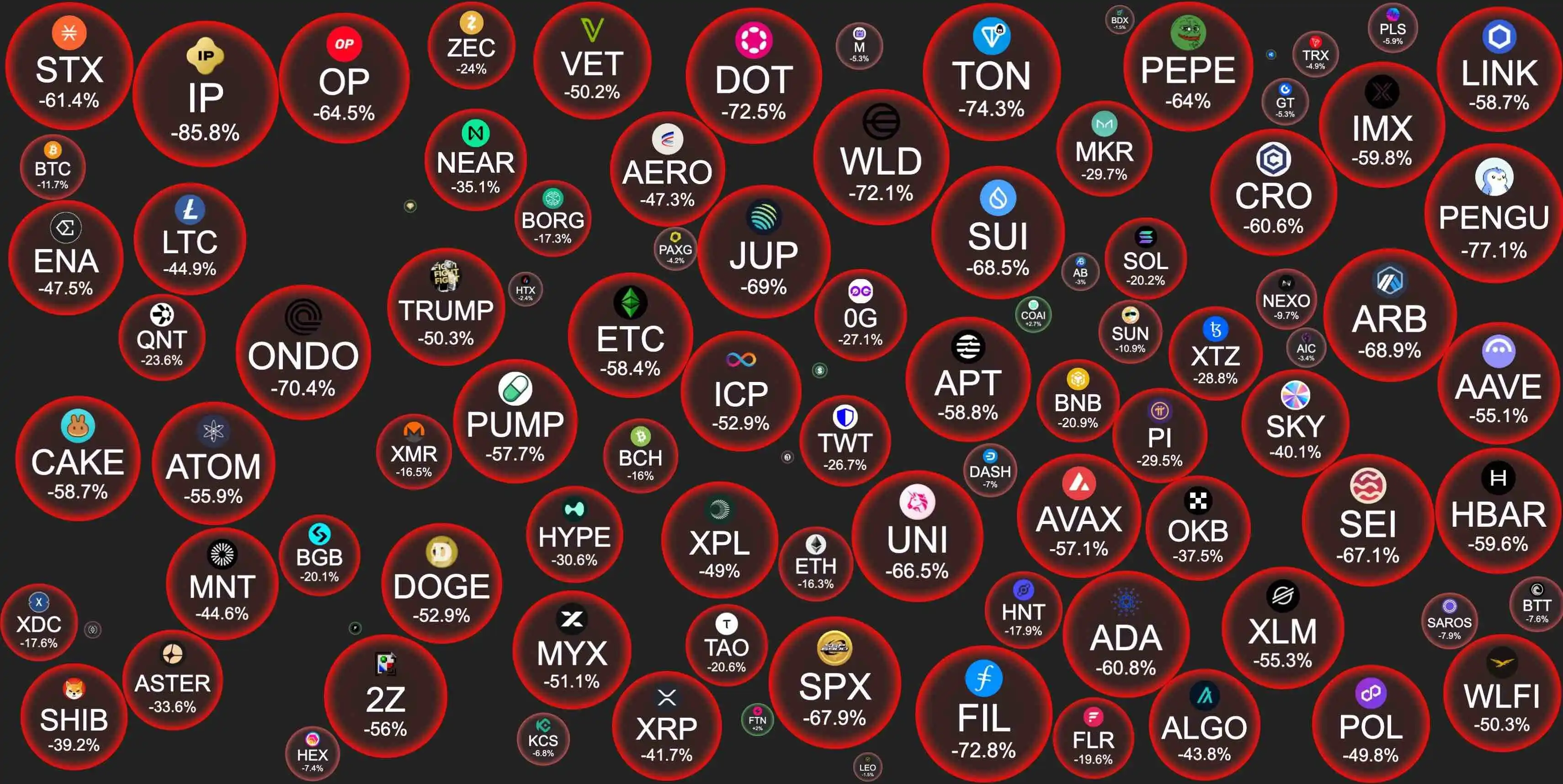更为夸张的还是其他更小市值的山寨币,或受市场连环清算影响,多个山寨币短线跌幅超过 80% 甚至 90%。本人亲历过 312、519,但记忆中也未曾见过山寨币集体出现如此夸张的单日跌幅。