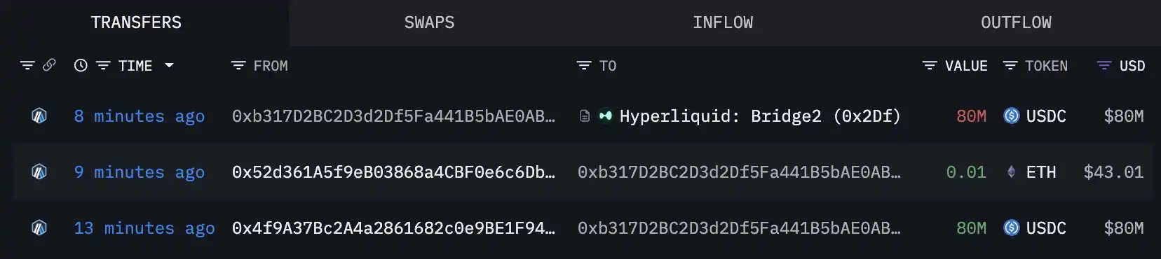 其先是向 Hyperliquid 存入 8000 万美元,开设了 3477 枚 BTC 的 6 倍空单;此外,还向币安存入了 5000 万美元的 USDC。地址:0xb317D2BC2D3d2Df5Fa441B5bAE0AB9d8b07283ae;