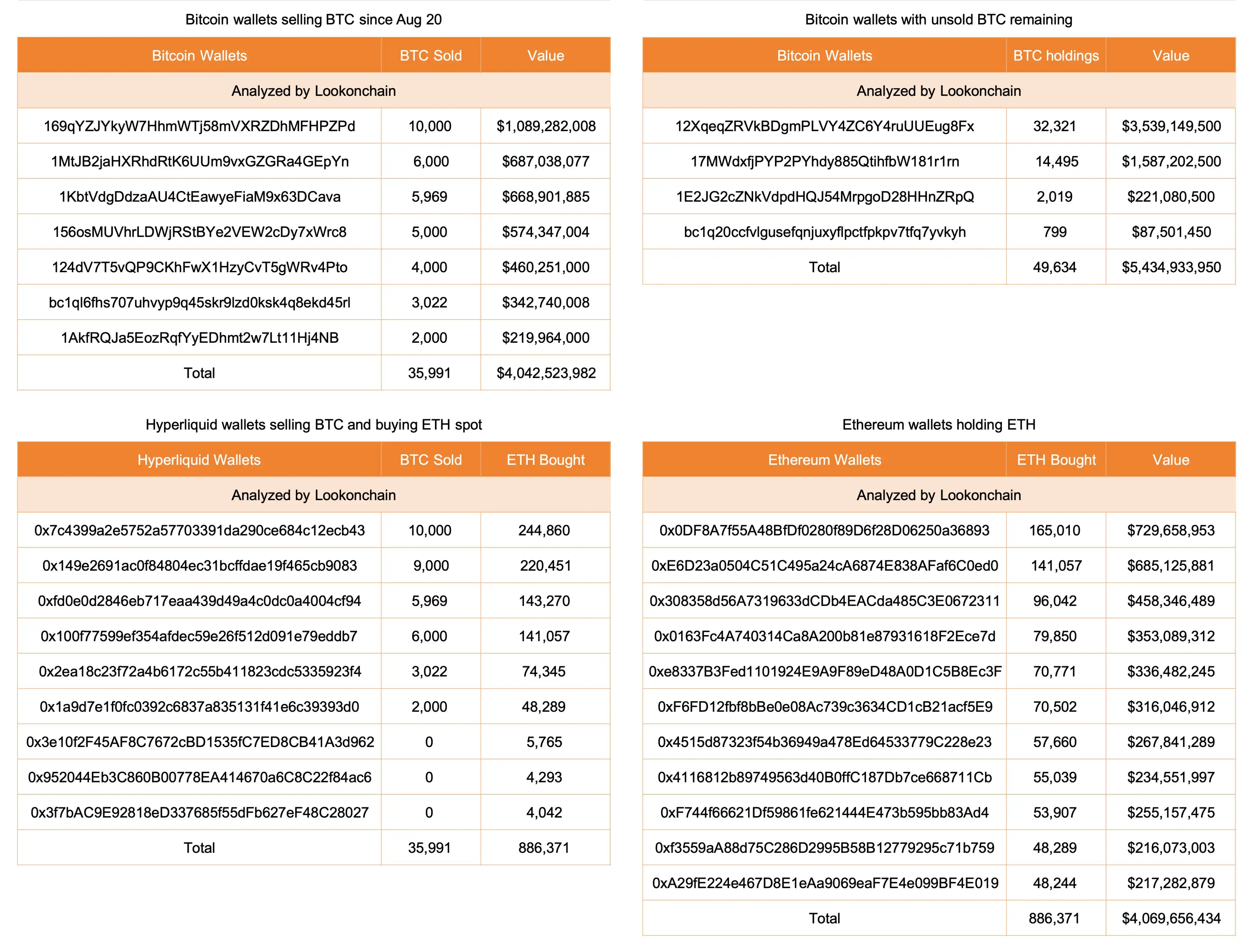 某浮盈超 7000 万美元的 BTC OG 巨鲸最早的交易操作可以追溯至 8 月 20 日:据 LookonChain 监测,自 8 月 20 日,该交易员/机构就在 Hyperliquid 出售了近 3.6 万枚 BTC 并买入超 88.6 万枚 ETH,彼时 ETH/BTC 汇率为 0.0406;在其其余 4 个钱包中,仍持有超 4.9 万枚 BTC,价值 54.3 亿美元。