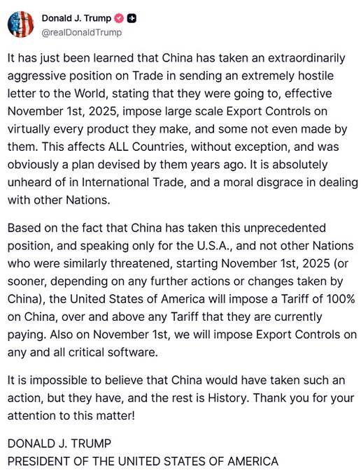 美国总统特朗普在社交平台 Truth Social 上发文,提到可能对来自中国的商品征收“大规模”的新关税。