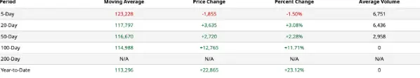 目前价格略低于 MA5,但依然显著高于 MA20 与 MA50,意味着短线动能有所放缓但未破坏更广阔的上行结构。若能重夺 ~$123,200(MA5),有望再度测试 $124,000 阻力区;若跌破 MA20(~$117,800),短线回调压力将上升。