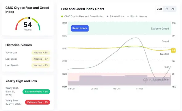 截至 9 月 26 日,恐惧与贪婪指数为 54,处于“中性至偏贪婪”,显示整体情绪谨慎乐观。投资者仍对短期波动保持警惕,但信心未明显削弱。