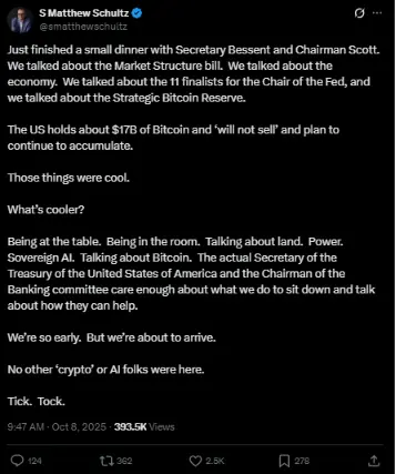 2025 年 10 月 9 日,Yahoo Finance 报道称美国持有约 $17B 的比特币,并概述了在 2025 年早些时候首次提出的“战略性比特币储备”框架下,主要通过没收所得进一步累积 BTC 的计划。