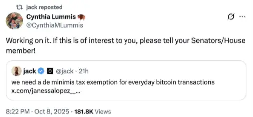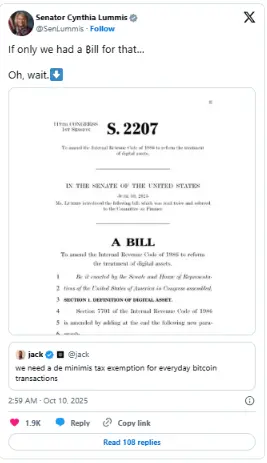 2025 年 10 月 9 日,政策倡议者放大 Lummis 的呼吁,即对小额 BTC 消费免税以常态化日常支付。