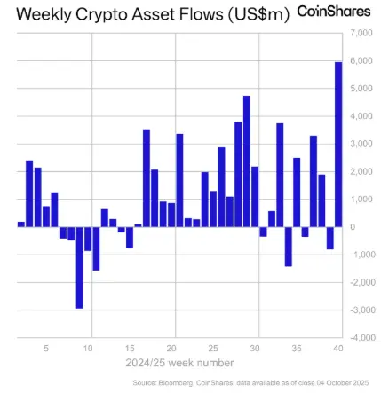 2025 年 10 月 9 日,CoinShares 数据显示,数字资产基金单周净流入创纪录达 $5.96B,其中比特币产品吸纳 $3.55B,美国 ETF 单日峰值出现在 10 月 3 日。