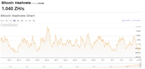 本周比特币网络算力在 CoinWarz 的 1 个月图上于明晰的区间内波动,期末附近的头部估计值为 1.040 ZH/s(区块 918,389)。过去 7 天,图上读数总体在高 900 EH/s 区间与低至中 1.1–1.2 ZH/s 区间之间运行(1 ZH/s = 1,000 EH/s)。其模式更像快速的盘中摆动,而非单边趋势,符合矿工削峰填谷、临时维护与地区电网动态在短时段改变可用电力、进而影响矿场开关机的特征。