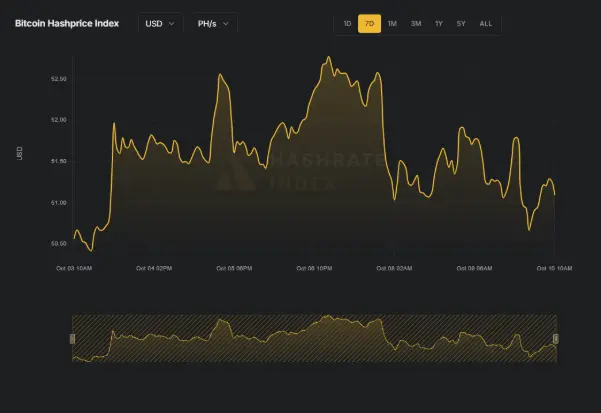 10 月 4 日至 5 日期间,hashprice 多数时间在 ~$51.3 与 ~$51.8 之间震荡,随后在 10 月 5 日晚短暂拉升至 $52.5 每 PH/s-日上方后回落。此类短促的上冲往往来自更强的现货与/或瞬时走高的手续费,从而抬升矿工以美元计的实际收入。即便是从 $51.5 到 $52.5 的一小时级别跳升,也为每 PH/s 每日多带来约 $100 的收入,规模化后影响可观。