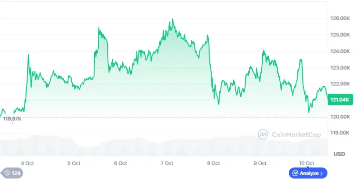 本周比特币处于宽幅但可控的区间内运行,10 月 6 日触及 $126,198.07 的历史新高后回落,至 10 月 10 日约 $121,048。较周一峰值回落约 4.08%,整体围绕 $120k–$126k 区间震荡。市值约 $2.41 兆美元,最近 24 小时交易区间为 $119,812–$123,739,显示周末前多空双方仍在积极博弈。