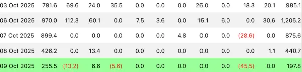 2025 年 10 月 9 日,资金流拆解显示美国载荷最大,瑞士/德国创本地纪录。