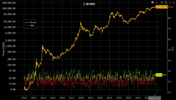 据 Bitbo 数据,截至 10 月 10 日,比特币 14 日 RSI 为 66.02,处于轻度超买边缘。RSI 介于 60–70 通常反映强势上行动能,但若持续高于 70,可能预示短期回撤风险上升。