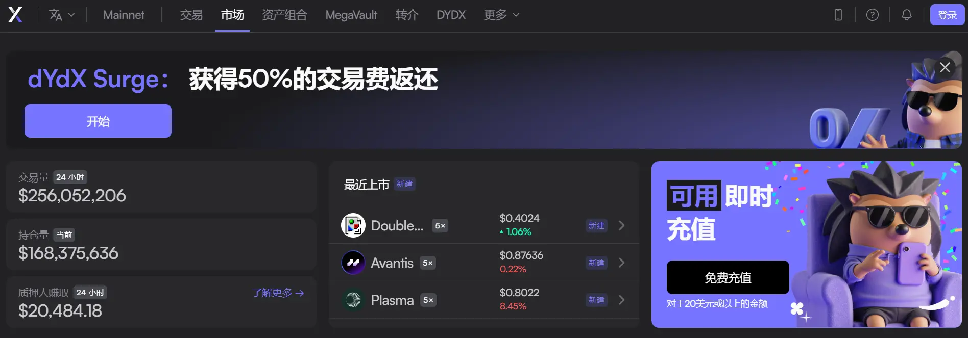 dYdX 是这一赛道的“先行者”,它几乎以中心化交易所的标准重新定义了去中心化杠杆交易的可能性。平台支持超过 200 个市场,最高杠杆达到 50 倍,累计交易量早已突破 2000 亿美元。在 2024 年升级至 V4 版本后,dYdX 将核心撮合引擎迁移至 Cosmos 独立链,实现了完全去中心化的订单簿架构,这一举措被视为里程碑式的转型。与自动做市商(AMM)模式不同,dYdX 的订单簿设计为专业交易者和机构用户提供了深厚的流动性和更低的交易成本。其分层手续费机制既兼顾了小额用户的零门槛体验,也为大额资金提供了折扣吸引力。对于依赖高频交易和精细化对冲的用户来说,dYdX 的模式接近中心化体验,但又保留了链上的透明性和资金自托管特性。然而,这种模式也存在挑战。订单簿撮合对链的性能要求极高,即便依托 Cosmos 独立链,其速度与稳定性仍难与 Binance、Bybit 等顶级中心化交易所匹敌。此外,订单簿交易本身的复杂性提高了零售用户的学习门槛,不如 AMM 模式直观易懂。因此,dYdX 的战略方向是在保持专业流动性的同时,继续强化社区治理和用户教育,逐步确立“链上专业衍生品交易所”的定位。