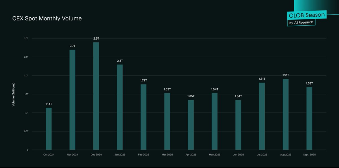 CEX 表现:2025 年第三季度,CEX 现货交易量估计超 5.4 万亿美元,仍保持主导地位,较 2025 年第二季度增长 25%。