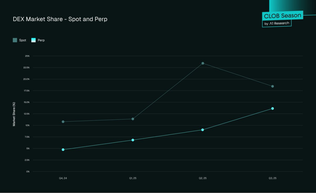 现货市场:DEX 的市场份额从 2024 年第四季度的 10.5%,上升至 2025 年第三季度末的 19%。