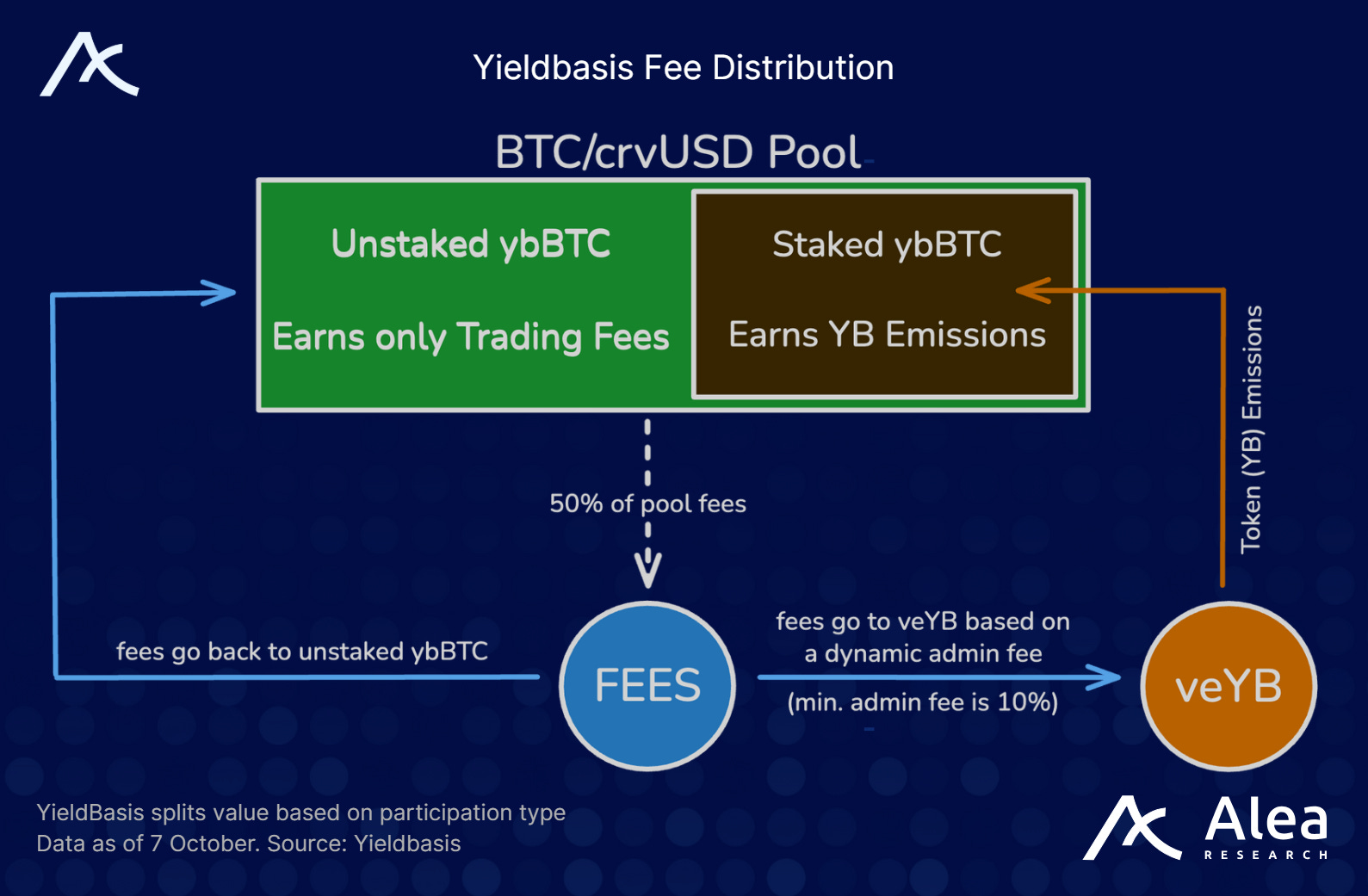 BTC/crvUSD 池的交易费用通过动态管理费的形式提供给 YieldBasis 流动性提供者 (LP) 和 veYB 持有者。其中 50% 的费用用于再平衡,剩余 50% 则根据 ybBTC 的质押份额,在未质押的流动性提供者 (LP) 和 veYB 之间分配。如果许多流动性提供者 (LP) 质押以赚取 YB 发行量,管理费就会增加,从而向 veYB 支付更多费用。但如果质押数量较少,流动性提供者 (LP) 获得的 BTC 计价费用就会更多。