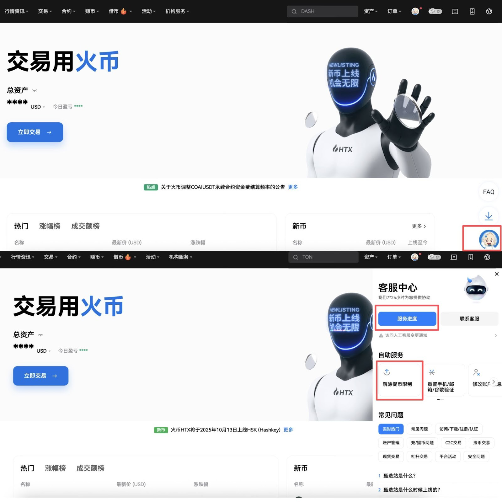 请您通过App或官方网站登录火币HTX后,进入官方【客服中心】-【自助服务】,点击【解除提币限制】,根据页面提示填写资料并提交工单。客服将在24小时内回复并告知处理进度。