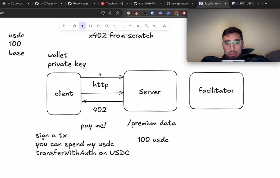 当用户或AI访问一个收费资源时,服务器返回402状态码,同时告诉你:这个服务要0.1 USDC,请付款到这个地址。