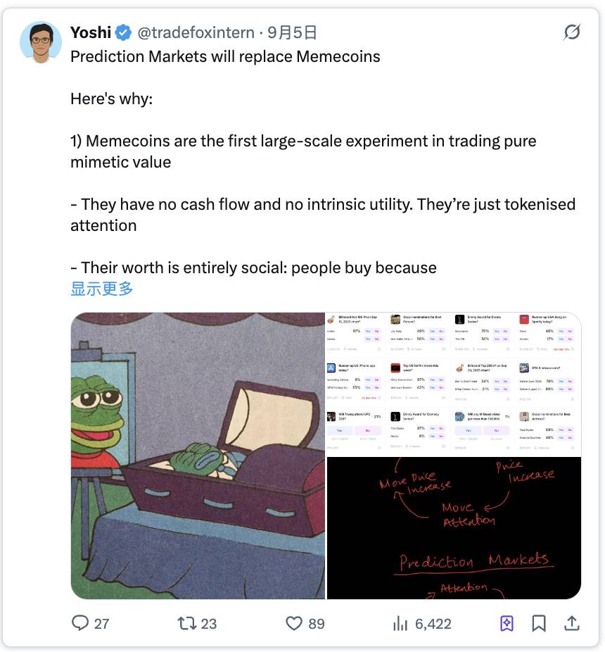 以下是一篇来自 @tradefoxintern 的优秀帖子,讨论为什么预测市场将取代 Memecoin :