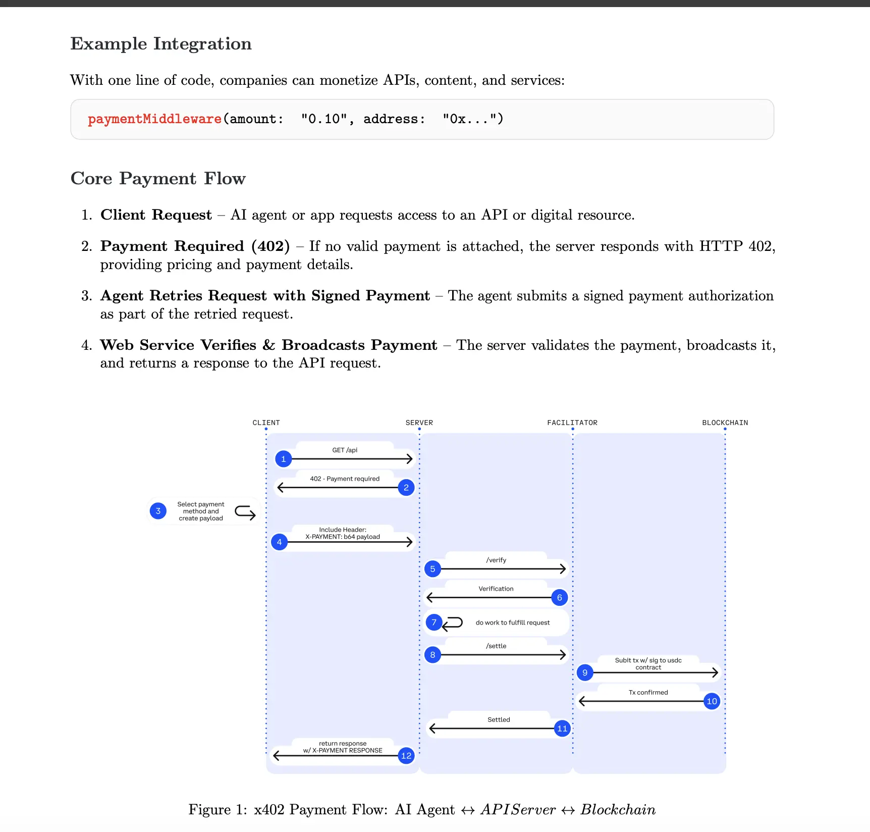 402响应: 如果请求未附带有效支付凭证,服务器会返回"402 Payment Required"状态码,并在一个JSON负载中详细说明所需费用(例如0.01 USDC)