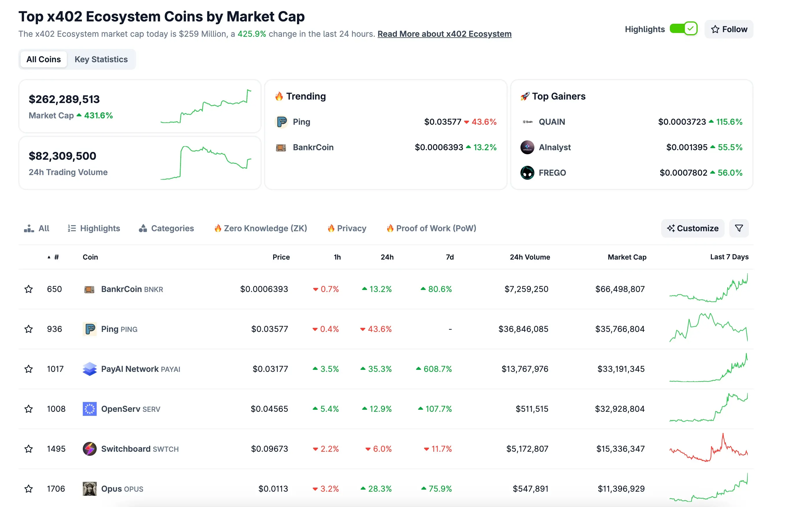 市场上(如CoinGecko)所提及的"x402代币"类别,指的是那些使用x402协议构建的项目代币。其中,最引人注目的是$PING。