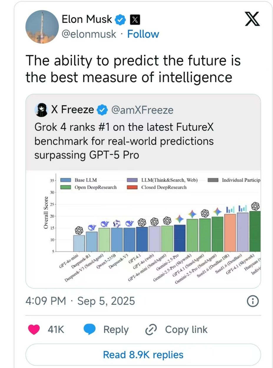 这一争议引出了一个疑问:什么是智能的终极测试?根据 Grok 4 的创造者、钢铁侠爱好者埃隆·马斯克的说法,预测未来是智能的终极衡量标准。