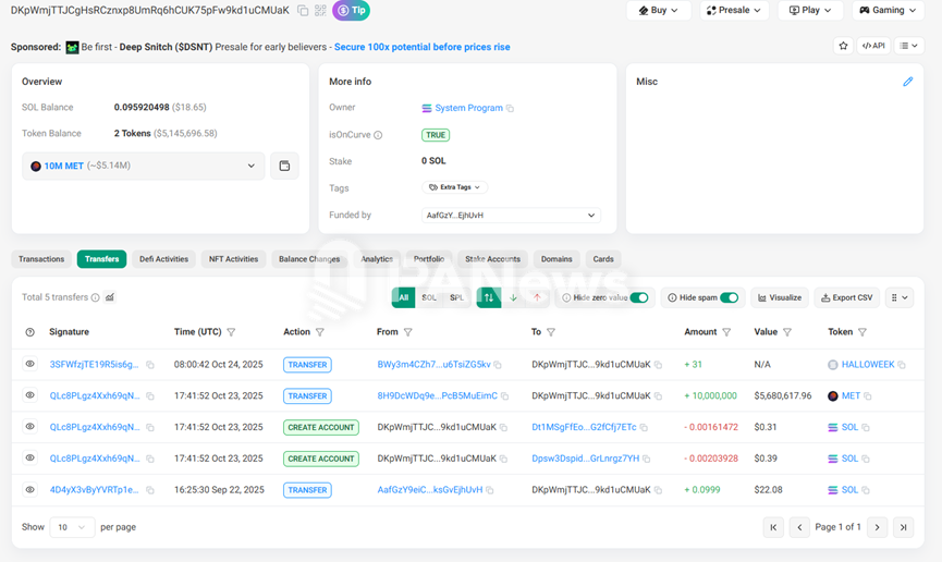 目前,这一抛售手法再一次用在了MET上,截至10月25日,该地址已经向Bybit交易所转入超过300万枚MET代币。