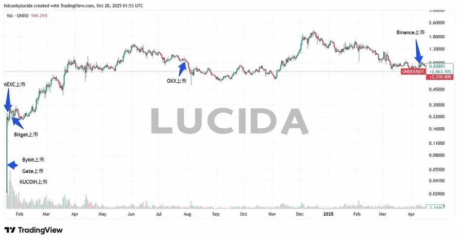 在 KuCoin、Gate、Bybit 率先启动,MEXC 接力上涨。而当它在 OKX 和 Binance 上线时,价格已进入回调阶段。