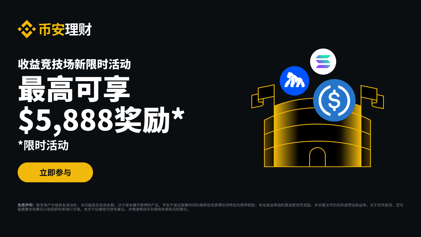 币安理财竞技场每周为您推出一系列新限时活动。请持续关注“币安理财竞技场”更多活动,通过币安保本赚币、ETH质押、SOL质押、双币投资等获得收益。