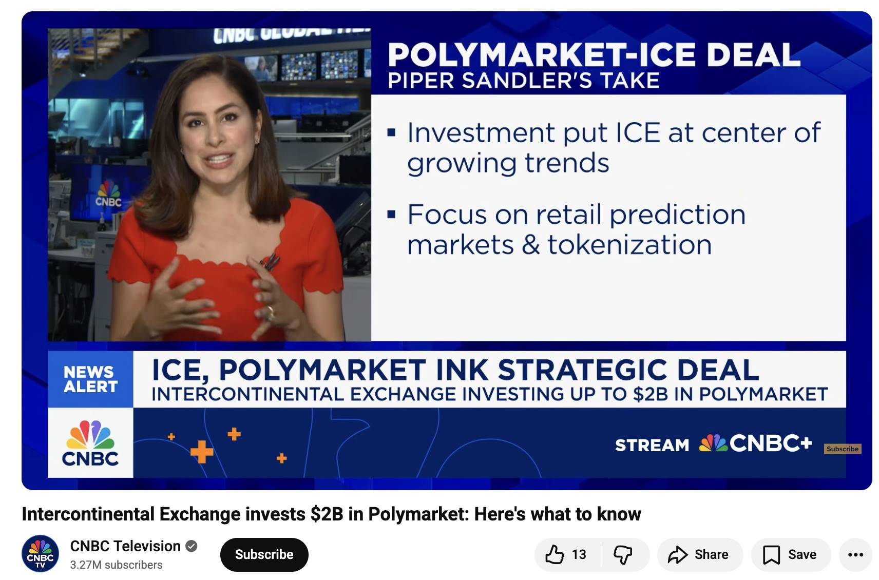 最令人震惊的,是纽约证券交易所母公司 ICE 对 Polymarket 的 20 亿美元投资。这不仅仅是一笔投资,更是传统金融对预测市场的「官方认证」。