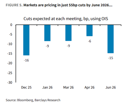 这意味着,在当前数据背景下,限制性的货币政策已无必要。巴克莱观察到,市场目前仅定价到 2026 年 6 月累计 55 个基点的降息,这种看法「过于一边倒」。
