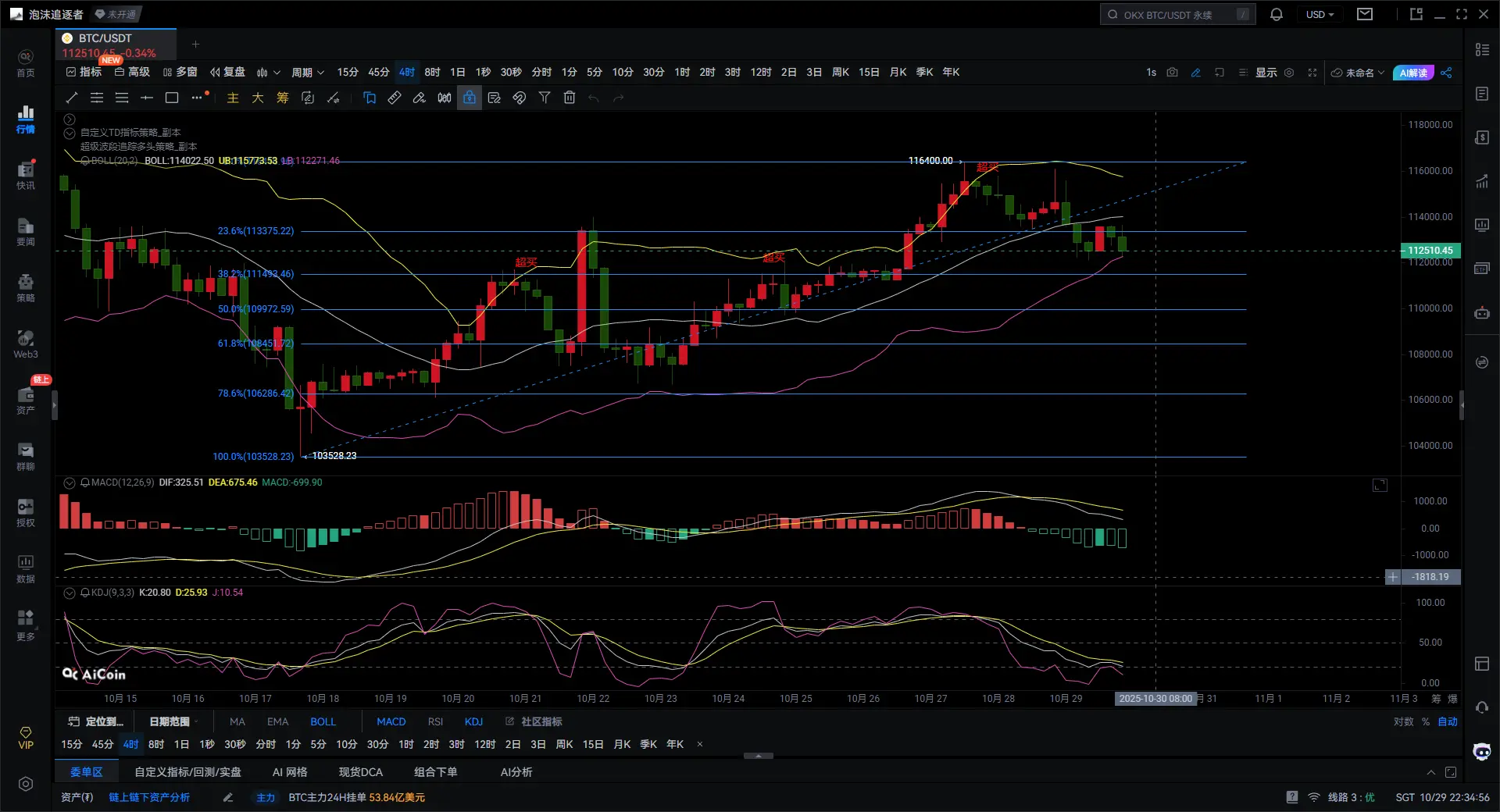 综合分析,整体走势仍处上升通道中的技术性回调阶段,属于回踩确认支撑。10月中旬以来的上涨主结构未破,回调深度受限于38.2%位,指标显示空头衰减。如果价格守稳中轨并突破114000,将确认反转信号。短线偏震荡偏强,中期趋势上行不变。