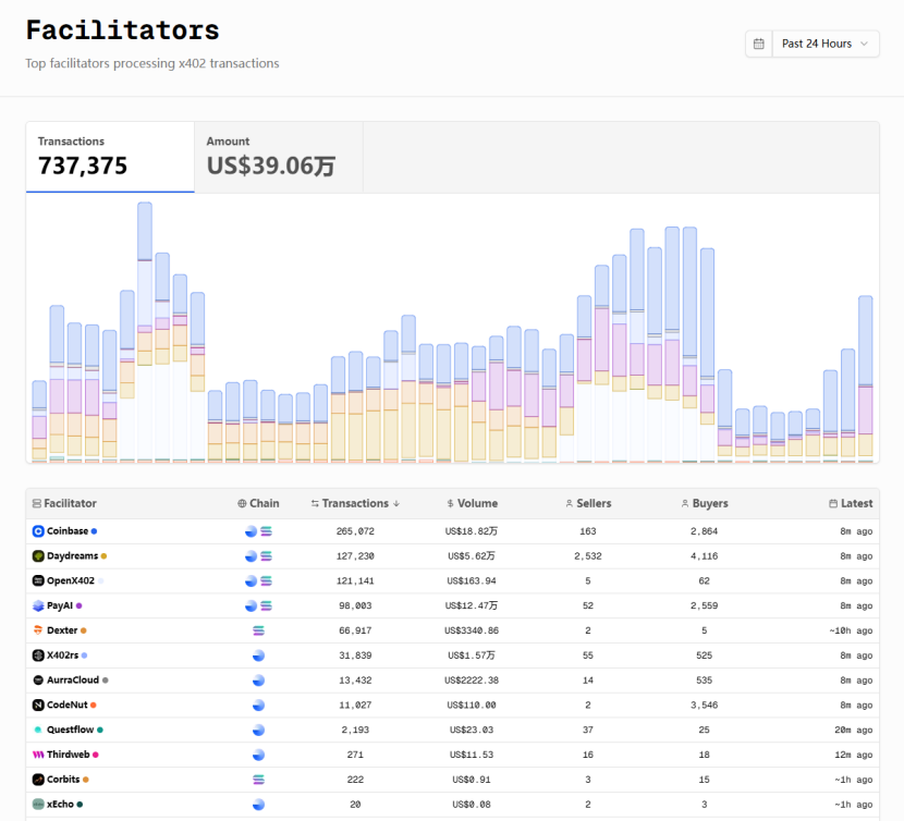 自我定位为 x402 Facilitator(撮合/收单/验证/结算层),面向 Solana 优先、跨多链,相较于Ping存在实际的使用场景,与之类似的还有Daydreams、OpenX402等,核心的依然是Coinbase自身提供的Facilitator。