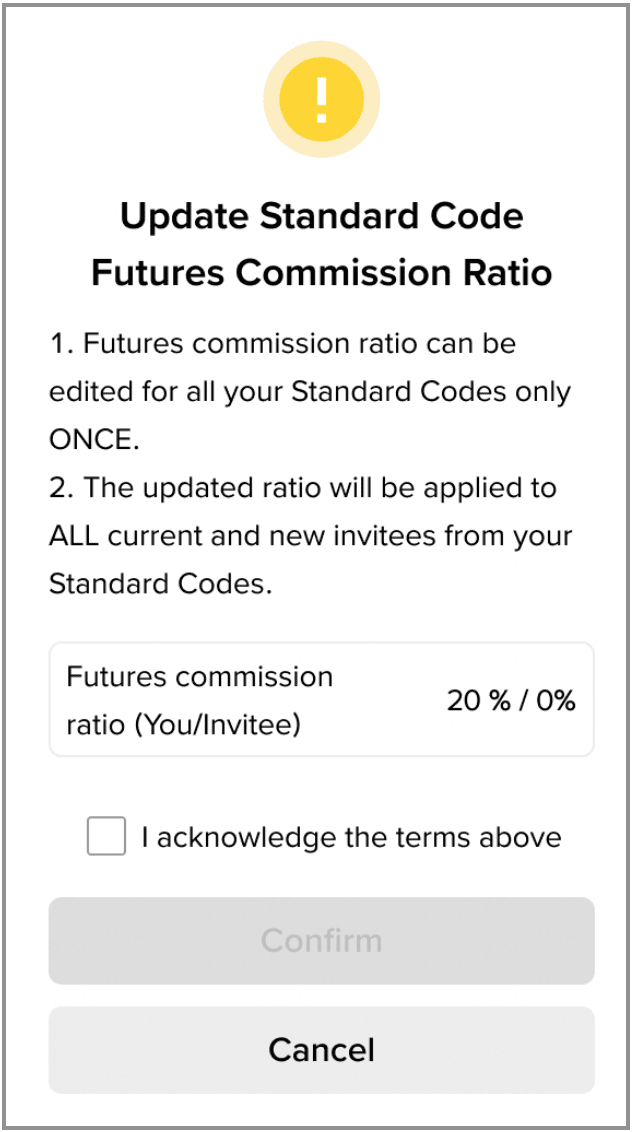 请注意,一旦确认合约比例,您所有返佣码的合约比例将无法再次更改。更新后的比例将适用于所有现有及新注册的受邀人,但已享有更高合约比例的现有受邀人将保持不变。