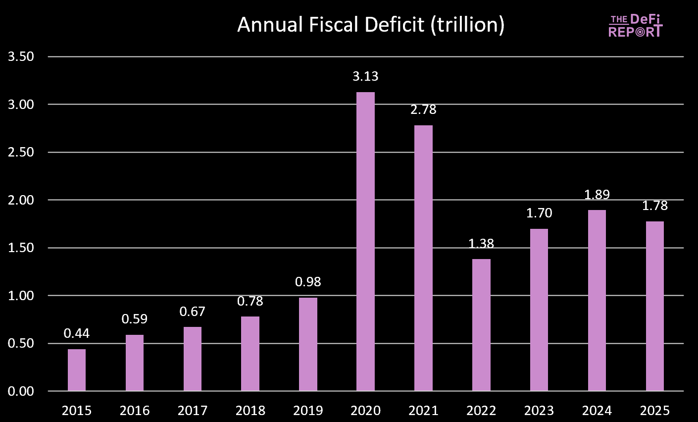 2025 财年刚刚结束,赤字略有下降——这主要是由于税收增加(关税)而不是支出减少。然而,预计《大美法案》(Big Beautiful Bill)将通过削减医疗补助(Medicaid)和补充营养援助计划(SNAP)的福利来实现支出削减。
