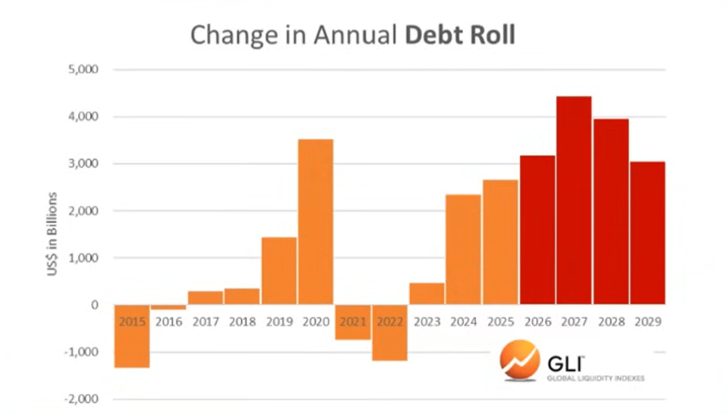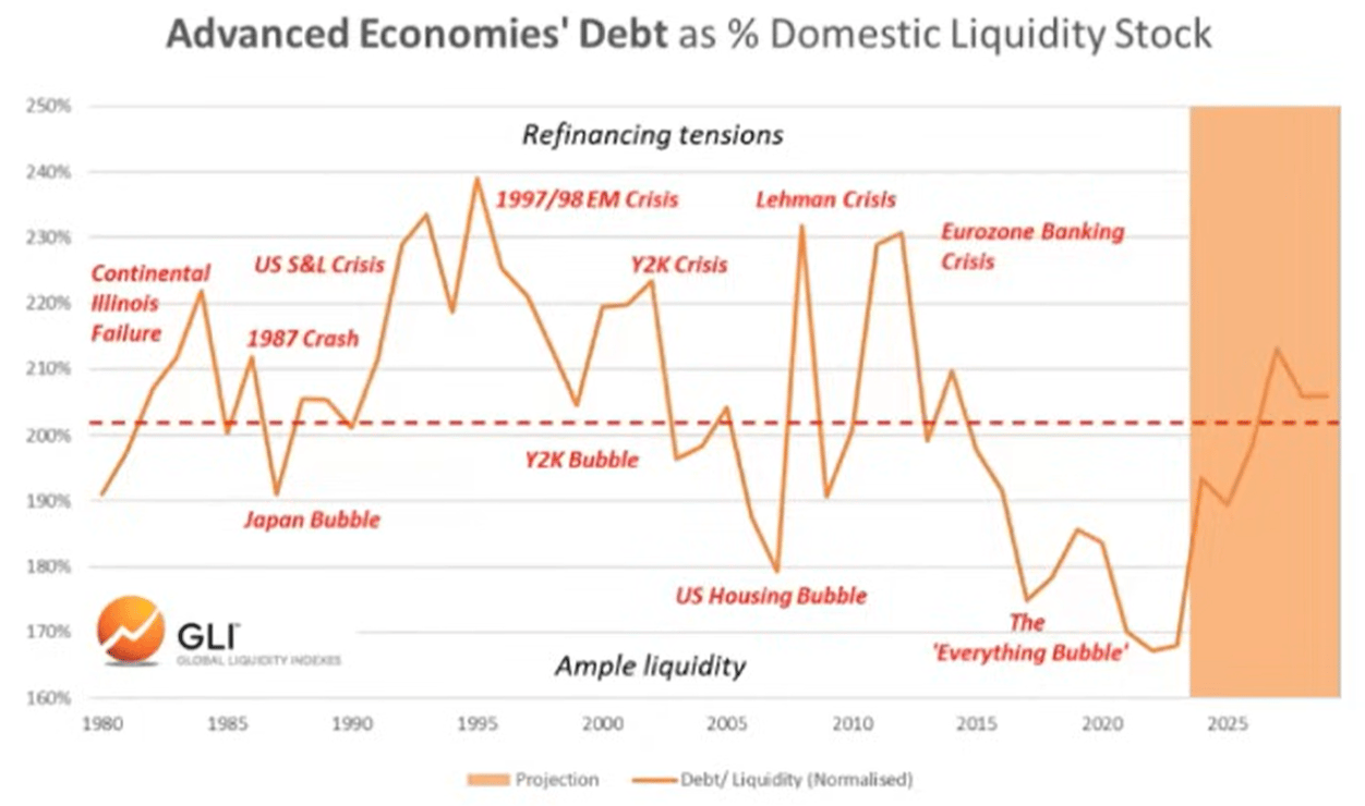 根据全球流动性指数,主要经济体的债务与流动性比率在去年底达到了自 1980 年以来的最低水平。它现在正在上升,预计将持续走高至 2026 年。