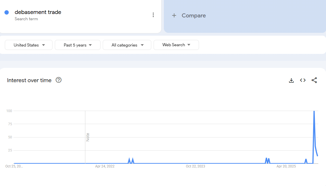 我们认为,对「贬值交易」感兴趣的时机是几年前。那时比特币价格为 2.5 万美元,黄金价格为 2 千美元。那时除了加密货币和宏观分析师之外,没有人谈论它。