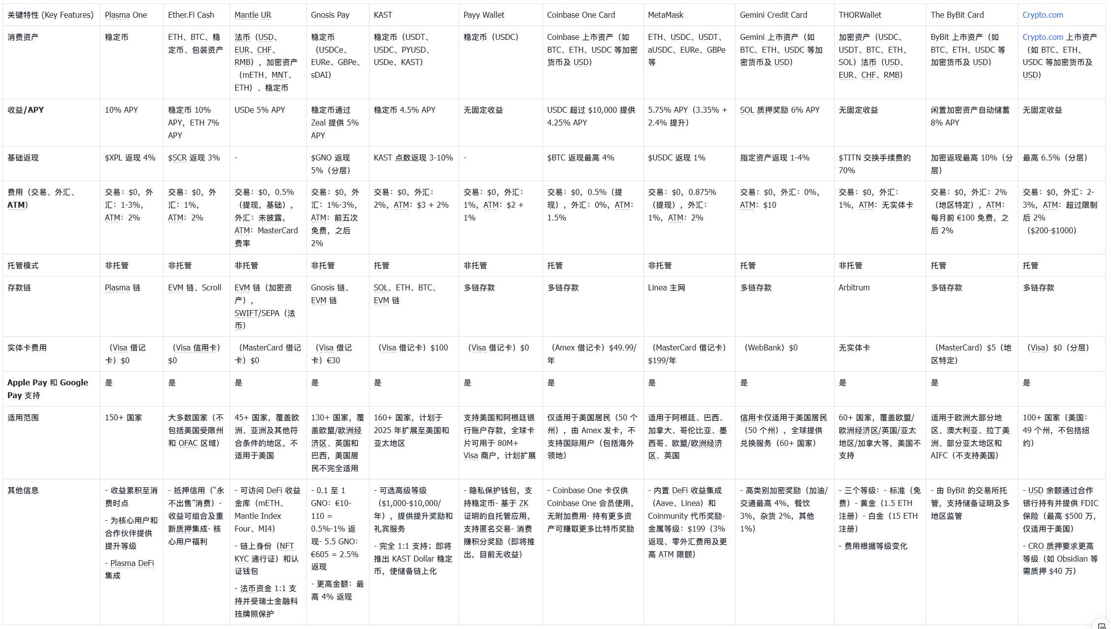 最终,客观的决策矩阵展示了每张加密卡的优势,并聚焦于现实用户关心的关键点:真正落地的收益、不被削减的奖励、托管方式、费用以及产品当前的适用范围。