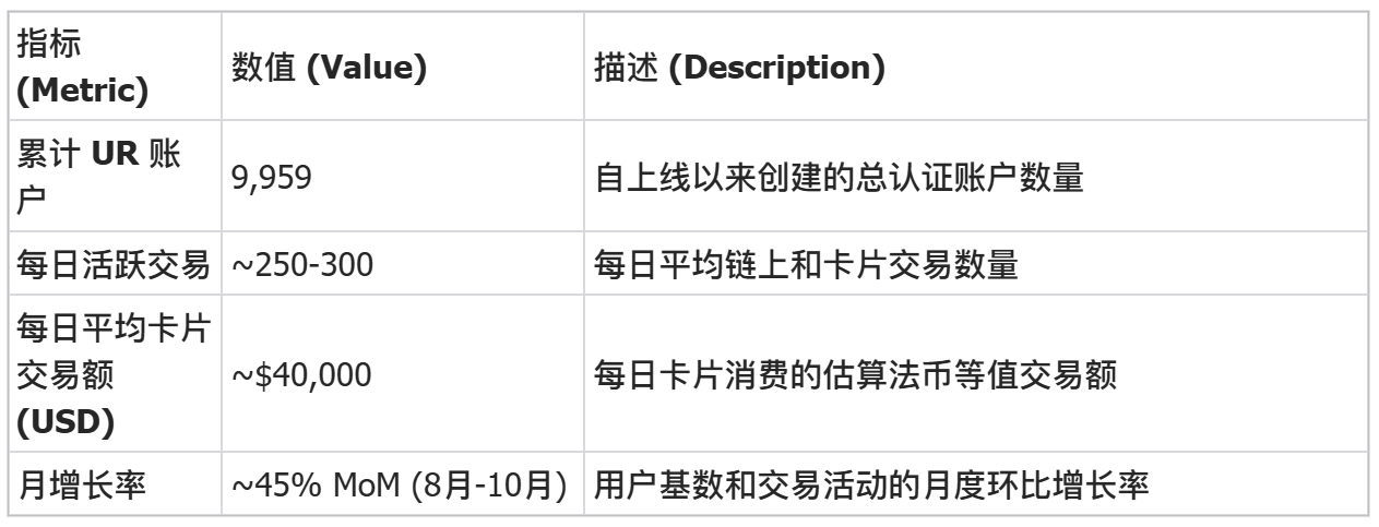 自 2025 年中期推出以来,UR 展现了强劲的早期发展势头,累计账户接近 10,000 个,生态系统内的活动持续增长。每日交易量稳定在 250 至 300 笔之间,而主要资产的平均卡消费额超过 40,000 美元/天。