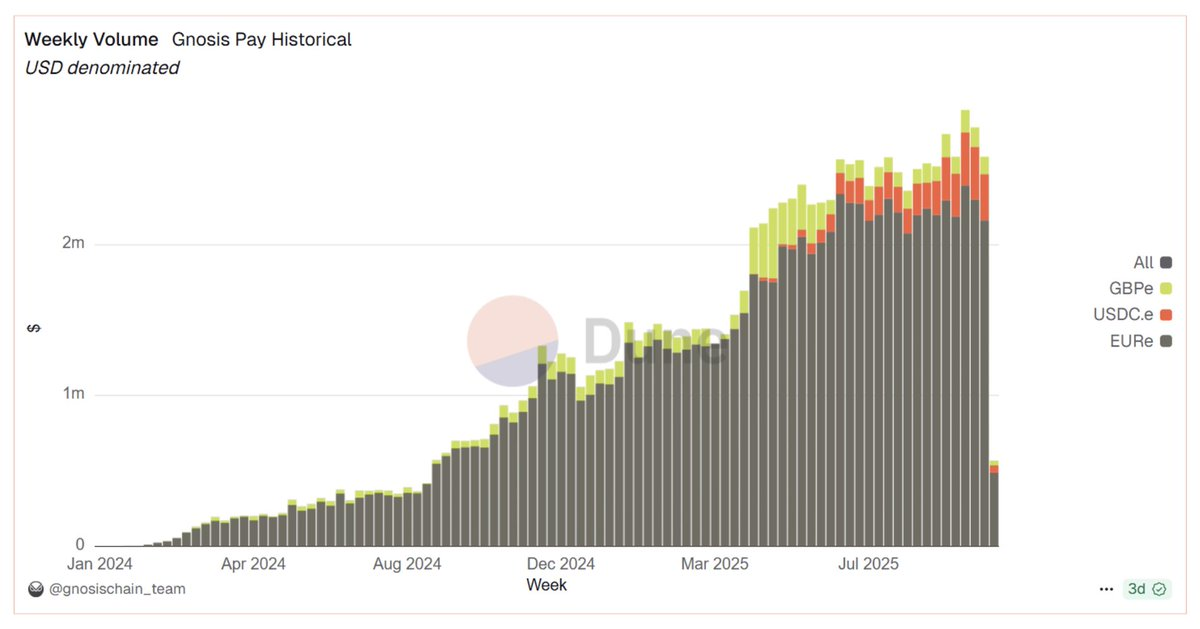 来源:Dune Analytics — Gnosis Pay Analytics (@gnosischain_team) | Data as of October 23rd 2025