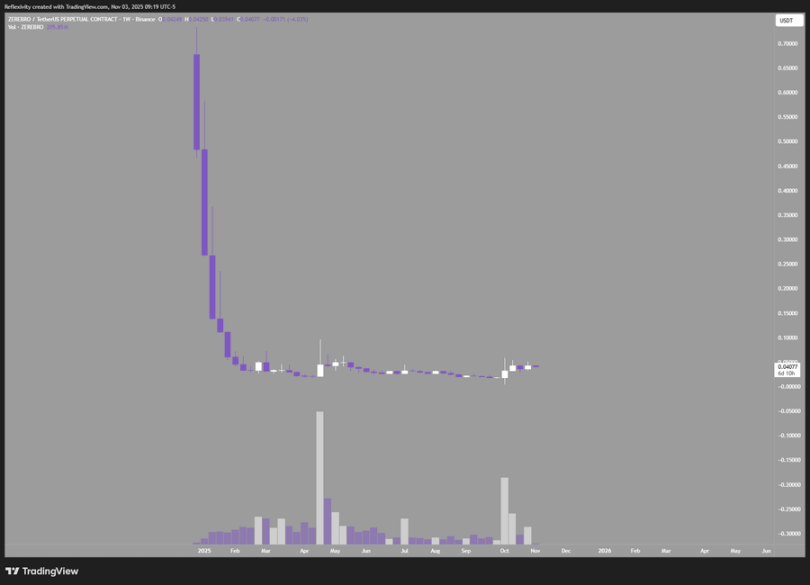 以这张图表为例,它展示的是 Zerebro,从 2000 万美元市值一路飙升至 7 亿美元峰值,带来 30 倍回报;但它也从高点下跌了 99%,几乎回到了最初的起点。