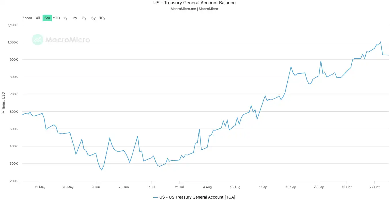 自 2025 年 10 月 10 日停摆开始,TGA 的余额从约 8000 亿美元膨胀到 10 月 30 日突破 1 万亿美元。短短 20 天内,超过 2000 亿美元的资金被从市场中抽走,锁进了美联储的保险柜。