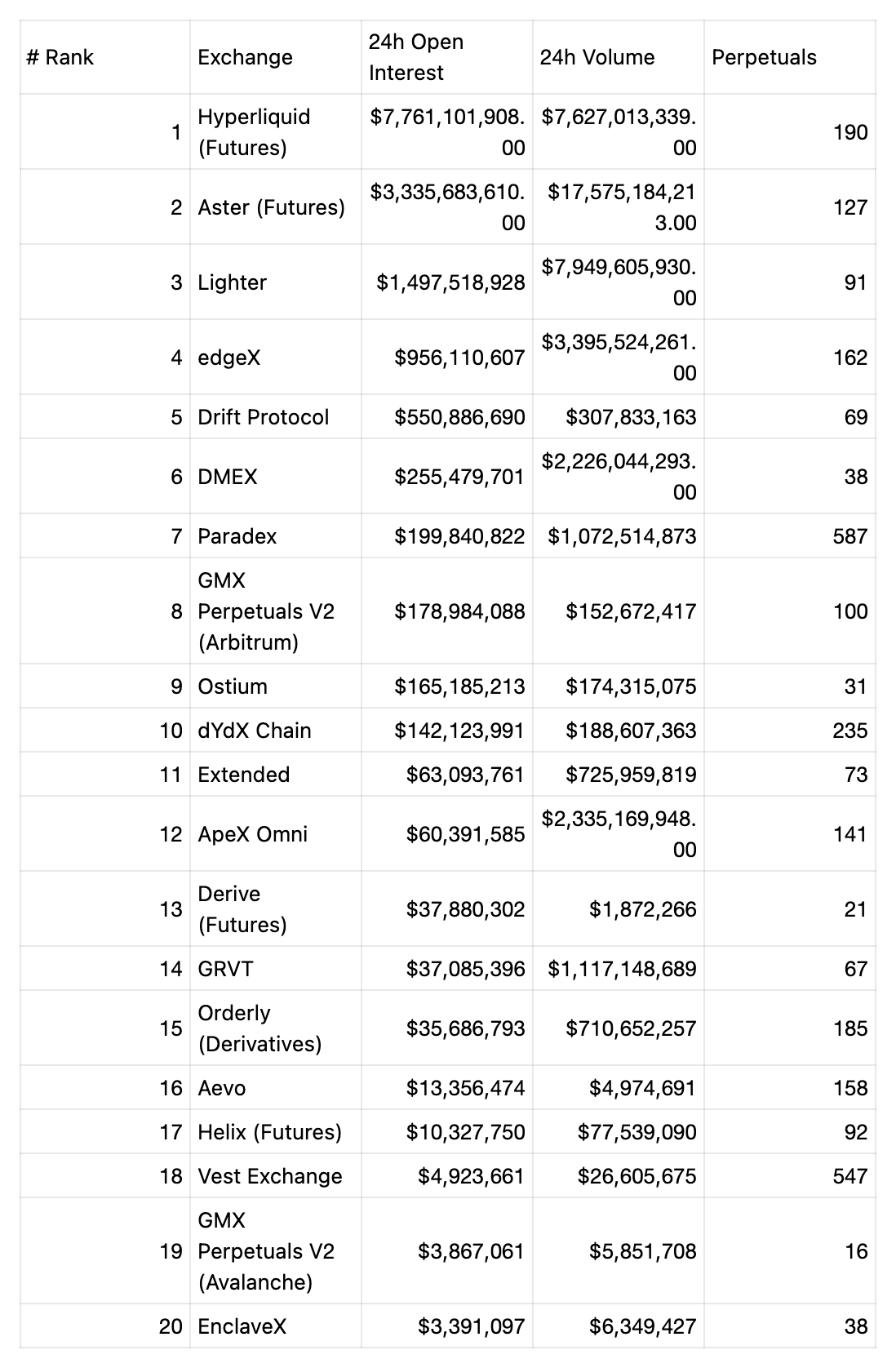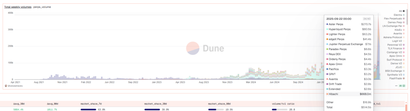 基于2025-10-21的数据,当前Perp DEX市场呈现明显的头部效应。