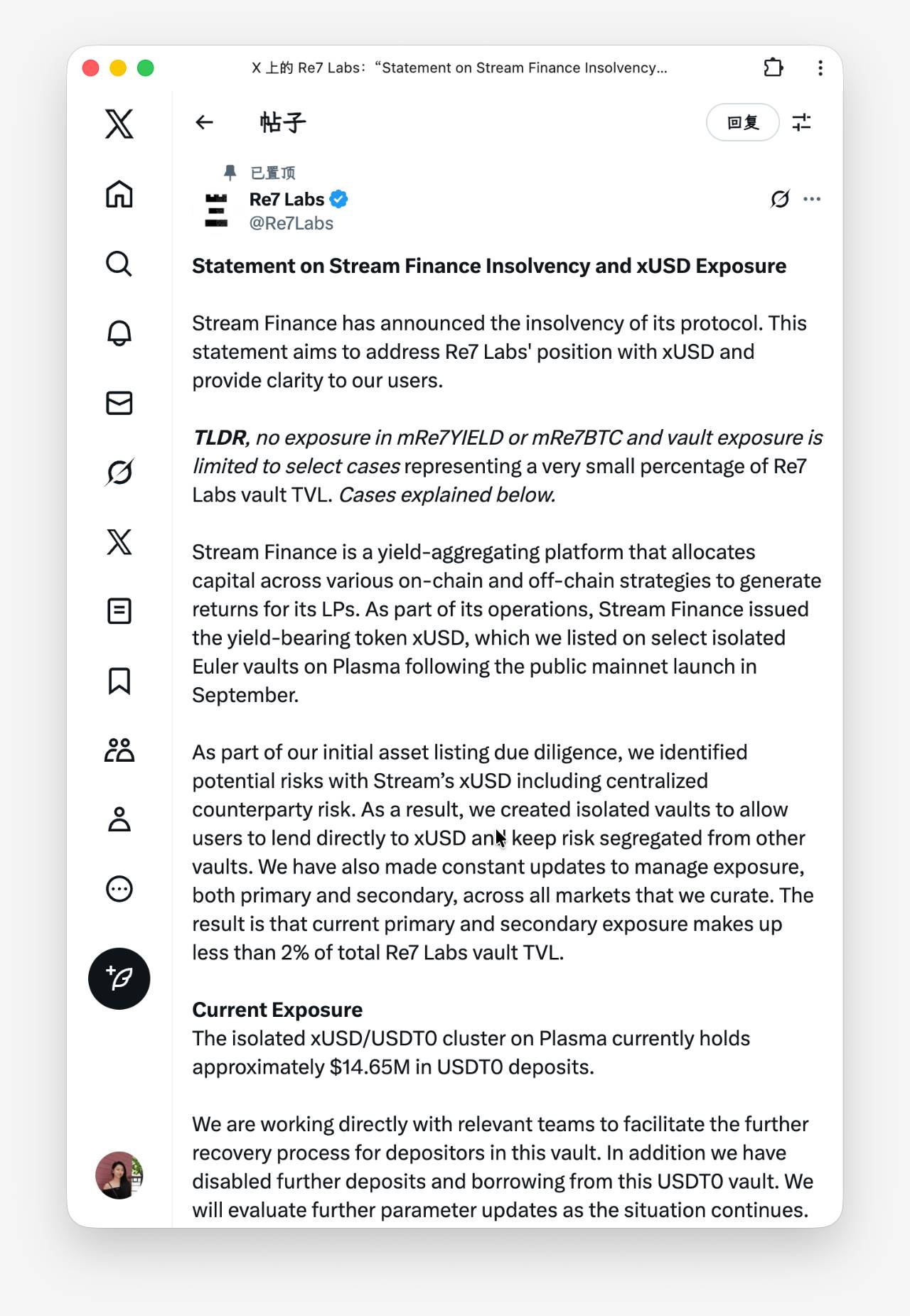 事实上,协议之间直接勾兑早已不是新闻,Ethena 引入 CEX 资本的同时,便具备 ADL 清算时的部分豁免权,回到 xUSD,在众多金库主理人的回应里,Re7 最有意思,“我们识别到了风险,但是在用户强烈请求下,我们还是上架了”。