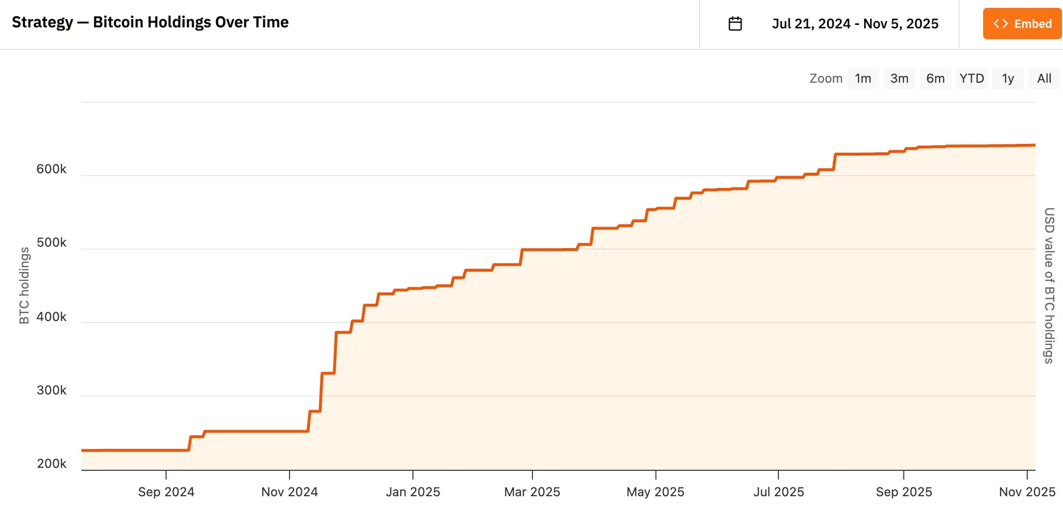除了ETF资金流出和投资者套现,企业的比特币财库增持策略也在降温。过去,许多公司通过增持比特币来对冲风险、提升资产配置的灵活性。但近期数据显示,这一趋势正在放缓。如全球最大比特币持有企业 Strategy 在 8 至 10 月间仅增持约 1.2 万枚 BTC,远低于前期增速,其他企业增持速度也在放缓。这反映出机构对宏观环境的不确定性更加谨慎,开始减少对比特币的风险敞口。企业买盘减少意味着市场中原本稳定的“结构性需求”正在消失。当ETF资金流出叠加企业买盘减弱,市场的承接力下降,比特币价格对短期抛压的敏感度就会显著提升。这也是为何在11月初的下跌中,BTC价格能在短时间内迅速跌破关键支撑位的原因之一。