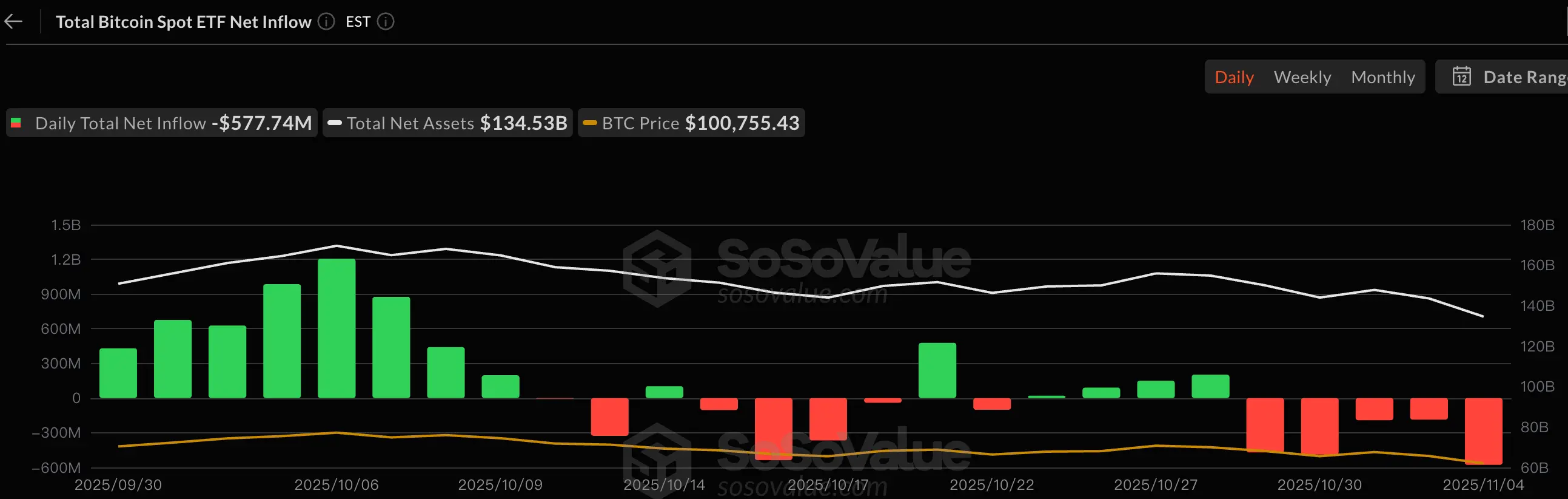 11 月 4 日,加密市场遭遇剧烈冲击,整体陷入低迷。比特币价格一度跌破 10 万美元关口,最低下探 9.9 万美元,这是自年内高点以来最显著的一次回调。与此同时,以太坊也未能幸免,价格最低触及约 3000 美元,创下近半年来的价格新低。山寨币和meme币价格同步大幅下跌,流动性和交易量骤降。